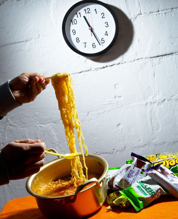 | 밤에 먹는 라면은 그대로 살로 갈까? 밀가루 자체 열량은 그리 높지 않지만 가공과정에서 기름 등에 의해 열량이 높아진다. | ||